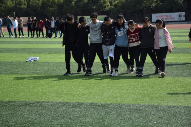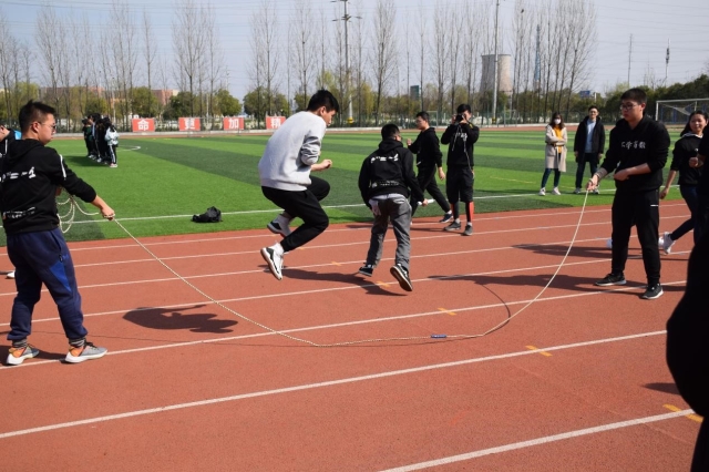 多人多足,这是一场默契与团结的较量。刚刚被绑在一起的八九个人还不能马上适应,一时间手忙脚乱,群龙无首。经过几分钟的磨合,同学们渐渐地找到了感觉,而正式比赛也要开始。有的队伍整齐一致,也有的队伍喊错口号,迈错了脚步;八字跳绳也十分有趣,大家慢慢摸索规则,鱼贯而入,轻盈一跳,潇洒漂亮。当然也有小伙伴多次尝试,未能成功跳过去。一致的整齐步调于足下展现,肆意的青春活力在绳间飞跃。