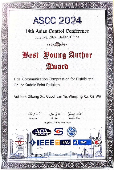 第十四届亚洲控制会议(Asian Control Conference,简称ASCC)于7月5日至8日在大连隆重举办。动画疯 2022级强基班本科生徐梓康和许文盈教授等人合作完成的论文《通信压缩下的分布式在线鞍点问题》(Communication Compression for Distributed Online Saddle Point Problem)荣获最佳学生论文奖,成为本届大会唯一获此殊荣的国内论文。