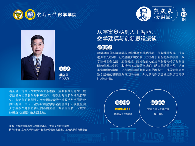 熊庆来大讲堂143期:2026. 03.13-从宇宙奥秘到人工智能:数学建模与创新思维漫谈- 谢金星-清华大学