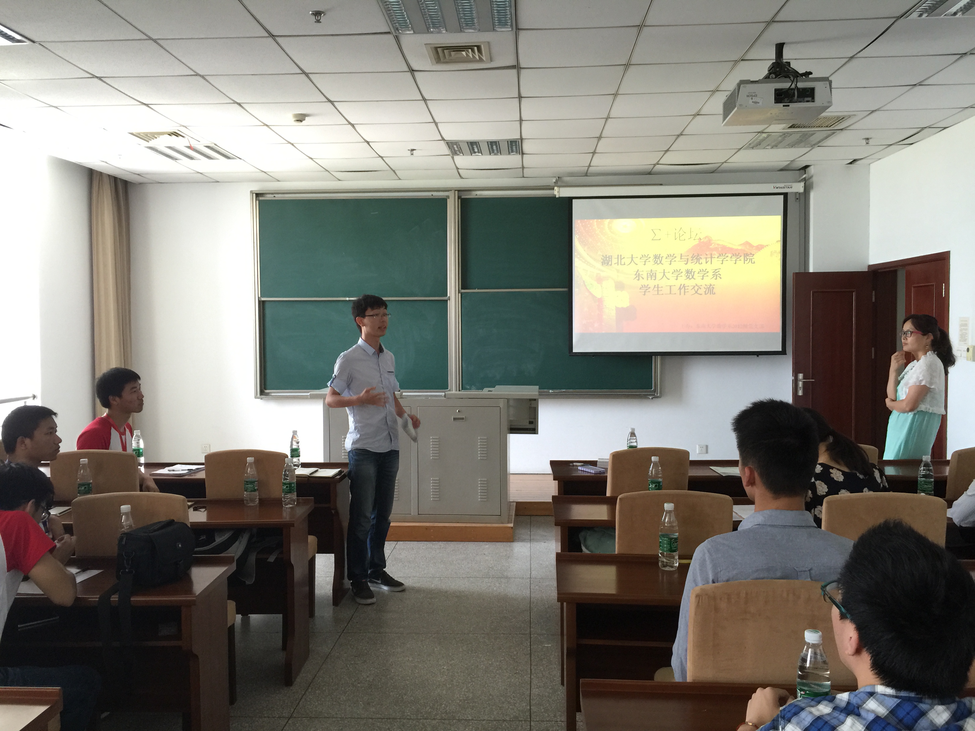 2015年6月5日下午,由数学系070131团支部、2012级本科生党支部主办的湖北大学数学与统计学学院与我校数学系交流活动圆满举行。湖北大学数学与统计学学院党委秘书陈冰老师带领6位学生代表一行来到我系,与数学系师生代表们一起展开交流。数学系团委书记袁煜昶老师、团委副书记王靖老师和优秀学生代表们一起参与了此次交流活动。
