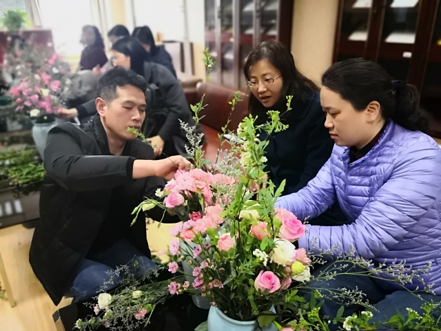 花艺是一种表现自然生命、展示自然魅力以及人的内心世界对自然、人生、艺术和社会生活体悟的媒介,是一种借助花草放松身心、陶冶情操、美化生活的方式。为庆祝“三八国际劳动妇女节”,陶冶老师们的情操,提高生活的品质,