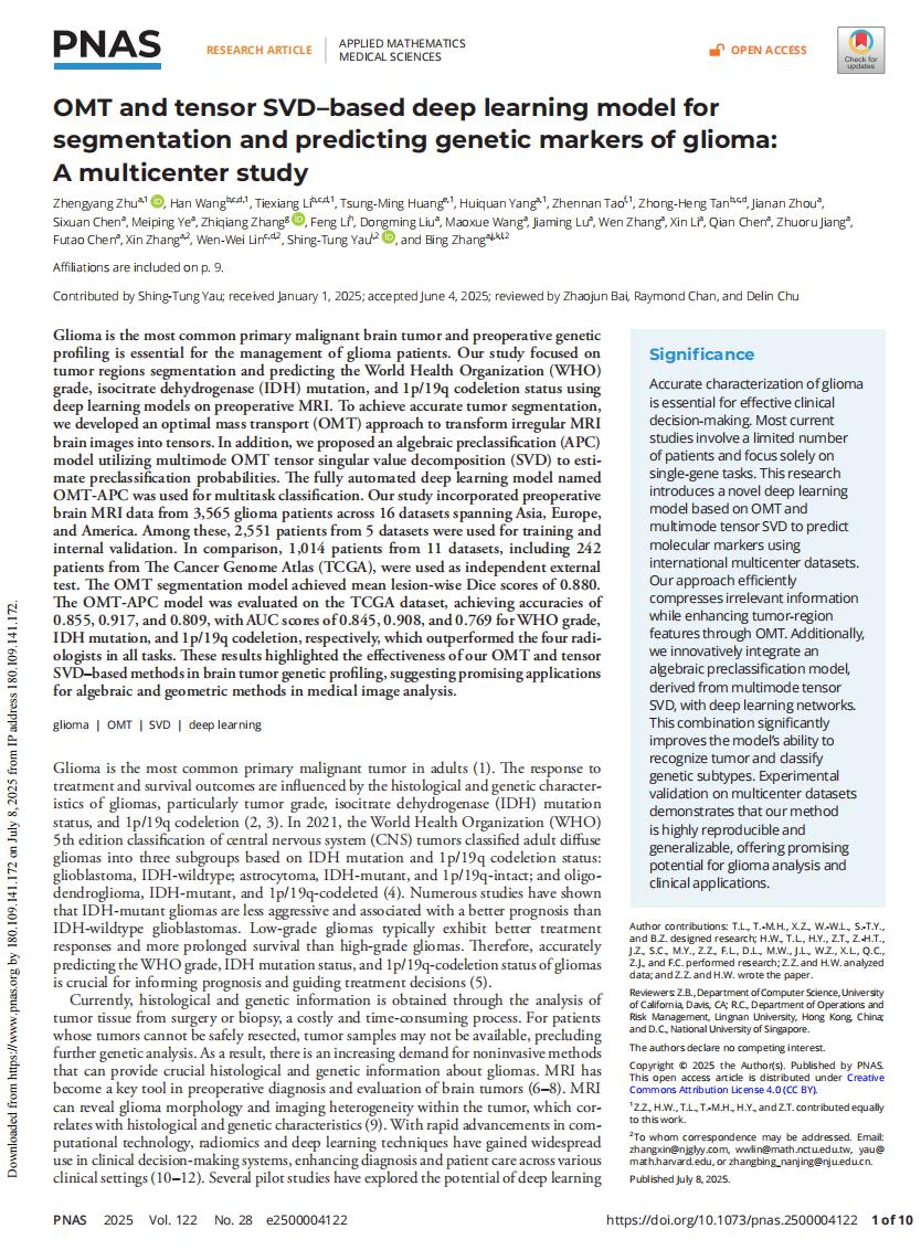 2025年7月9日,动画疯 、丘成桐中心李铁香教授与合作者在国际顶级学术期刊《美国国家科学院院刊》(Proceedings of the National Academy of Sciences of the United States of America,PNAS)上发表题为《用于神经胶质瘤分割和遗传标记预测的基于最优传输和张量奇异值分解的深度学习模型:一项多中心数据研究》(OMT and tensor SVD based deep learning model for segmentation and predicting genetic markers of glioma: a multicenter study)的学术论文。《美国国家科学院院刊》是国际顶尖综合性期刊,与Nature、Science、Cell并称全球四大综合科学期刊,近五年影响因子为10.6,位列中科院SCI一区12,学科涵盖生物、物理、化学、数学及社会科学,多学科大类排名前5%,对原创性要求极高。