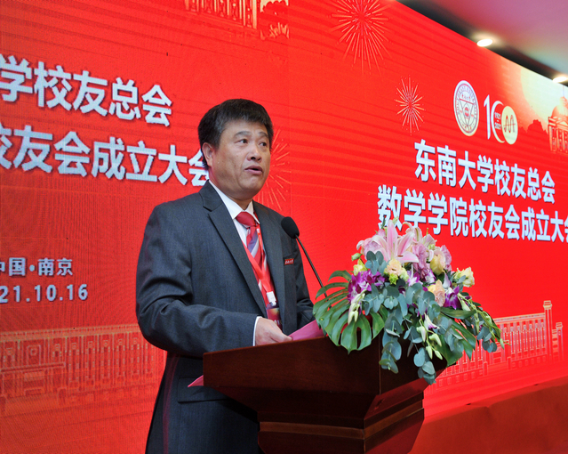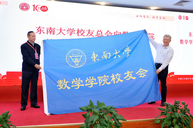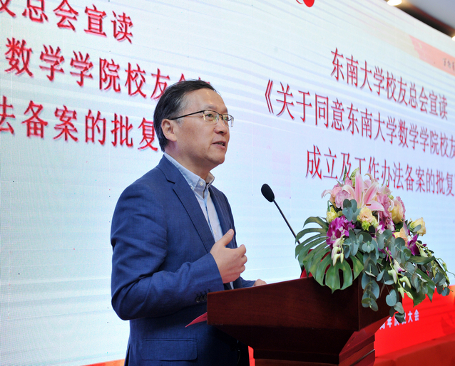 教育基金会执行副理事长金志军为数学学院校友会授旗,他代表东南大学校友总会对数学学院校友分会的成立表示热烈的祝贺!他表示我们数学学院校友会将更好地为校友服务,同时,也希望校友能够助力东大母校以及数学学院在人才培养、科技创新、学校发展等各个方面共同聚资、聚力、聚志,促进母校以及校友的共同发展!