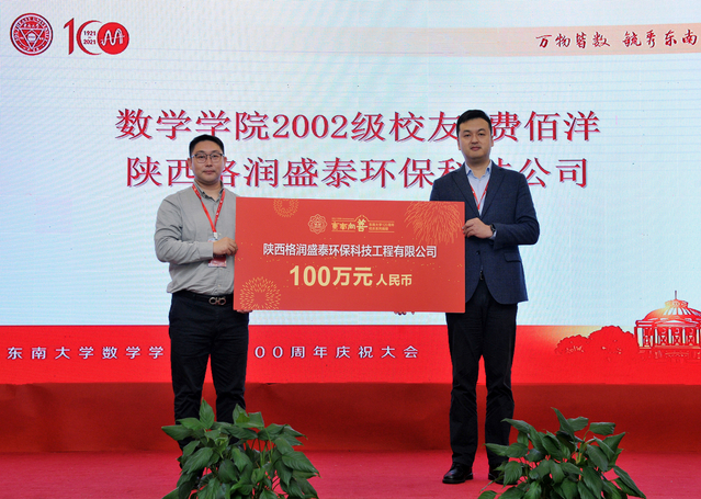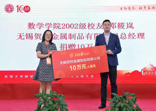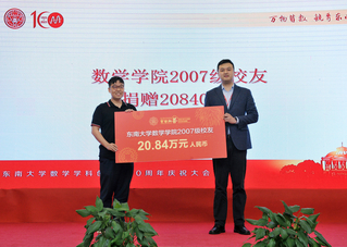 大会最后,举行了校友捐赠仪式。教育基金会秘书长芮振华分别接受了数学学院2002级校友、无锡贺邦金属制品有限公司总经理邓筱岚10万元捐赠、数学学院71971班10万元捐赠、数学学院2007级校友成龙、刘滕菲夫妇20万元捐赠、数学学院2007级校友20.84万元捐赠,以及数学学院2002级校友、陕西格润盛泰环保科技公司总经理费佰洋100万元捐赠。