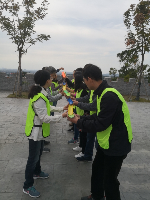 当天中午,在园区教官的指导下积极地投入到活动中。在团队建设中,每个队在队长的带领下创建了队名、队旗和队号,活动氛围变得活跃积极。在后面的几个趣味活动中,每个队的队员们在相互协作中体会到了团队的力量以及成功完成任务后的喜悦之情。拓展活动结束后,教职工们参观了园区的国防教育展览馆及抗战文化墙,参观了雷锋馆,重温雷锋精神,参观实体兵器展览区。