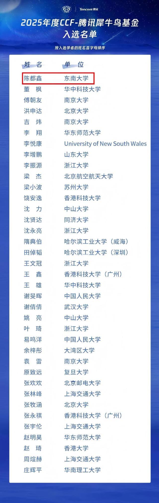 7月31日,2025年度CCF-腾讯犀牛鸟基金(以下简称“犀牛鸟基金”)入选名单公布,动画疯 陈都鑫副教授成功入选。2025年度犀牛鸟基金共收到来自130余所高校的390余份高质量申请,项目组特邀50余位学术界及腾讯技术专家组成评审委员会,基于科研能力、研究价值、学术创新性及方案可行性等维度进行评估,经过多轮严格评审,最终遴选出37位优秀学者。
